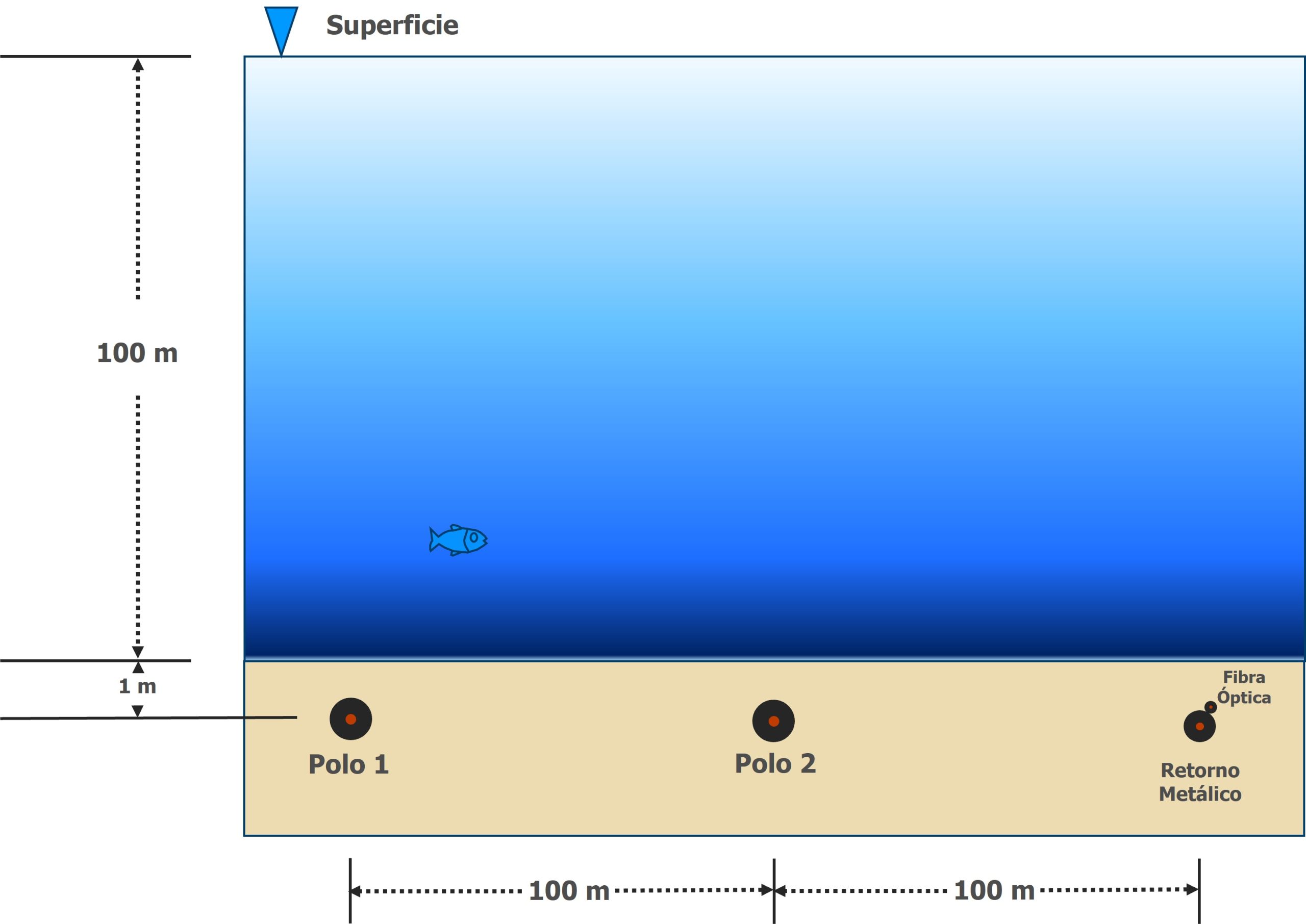 Cable submarino: El cable submarino se compone esencialmente de dos cables de potencia, conocidos como polos, y un cable de retorno metálico, que generalmente permanece inactivo y se activa únicamente cuando uno de los cables principales sufre una falla o requiere mantenimiento. Adosado al cable de retorno, se halla un cable de menor tamaño destinado a la comunicación de los sistemas de control y protección entre las dos estaciones convertidoras. Estos tres cables serán instalados en el lecho marino, mantenidos a una distancia de separación de 100 metros entre sí y enterrados a una profundidad de aproximadamente un metro. Exceptuando las zonas cercanas a los puntos de transición marino-terrestres, el cable se ubicará a unos 100 metros de profundidad.